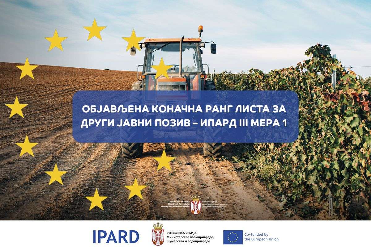 Министарство пољопривреде, шумарства и водопривреде – Управа за аграрна плаћања објавило је Коначну ранг-листу захтева за одобравање пројеката поднетих по Другом јавном позиву за инвестиције у набавку новог трактора, у оквиру ИПАРД III програма.